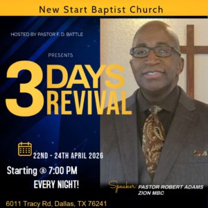 3 Day RevivalApril 12, 2026/in News/by Mary GibsonRevival starting from April 22nd – 24th, at New Start Baptist Church, 6011 Tracy Rd, Dallas, TX 76241 starting at 7:00pm all is welcome. https://zionmbcdallas.org/wp-content/uploads/2026/04/Church-3-Day-Revival.jpg 1080 1080 Mary Gibson https://zionmbcdallas.org/wp-content/uploads/2015/11/church-logo2-300x45.png Mary Gibson2026-04-12 18:14:522026-04-12 18:14:523 Day Revival