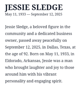 Family and friends are invited to the visitation that will be held Friday, September 26, 2025 from 12pm – 7pm at Golden Gate Funeral Home. A celebration of Jessie’s life will take place on Saturday, September 27, 2025, at Greater New Mt Pilgrim, located at 1943 Ann Arbor Avenue, Dallas, TX, starting at 11:00 AM.